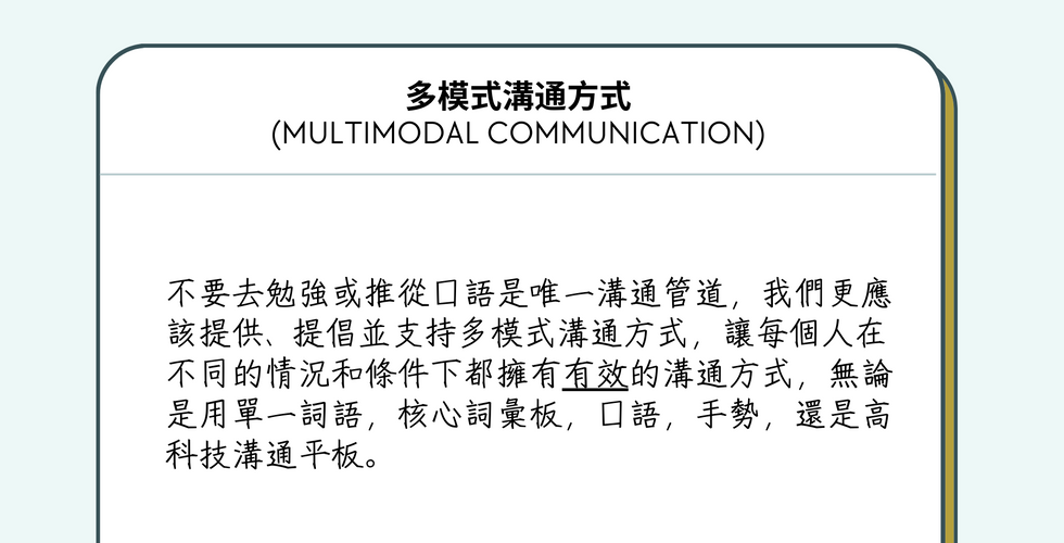 不要去勉強或推從口語是唯一溝通管道,我們更應該提供提倡並支持多模式溝通方式 (Multimodal communication) ,讓每個人在不同的情況和條件下都擁有有效的溝通方式,無論是用單一詞語,核心詞彙板,口語,手勢,還是高科技溝通平板。